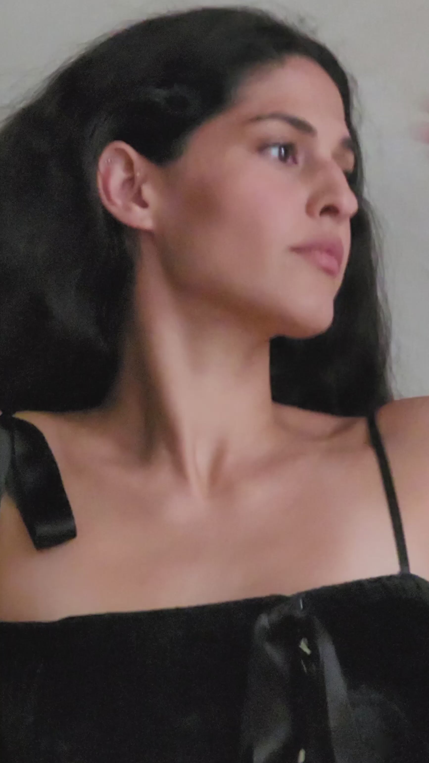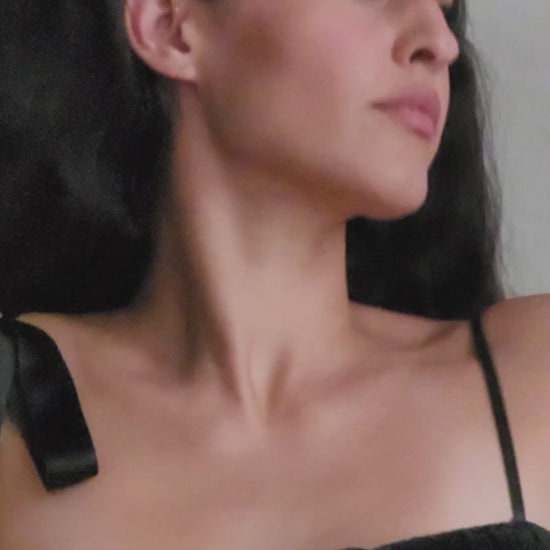 Exquisite wrap dress in black velvet edged with black chiffon with lurex dots. The velvet is smooth and leathery. Two black silk ribbon ties, one on the body and other on strap.