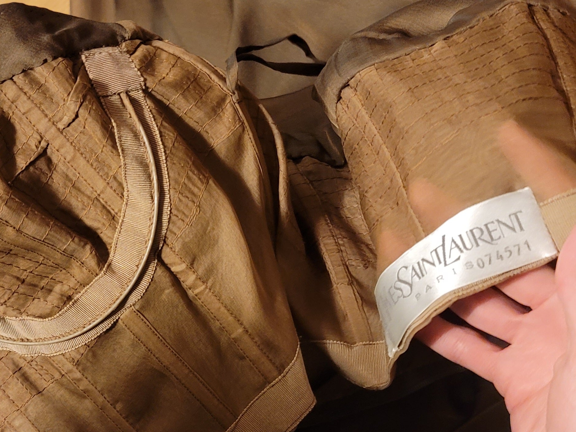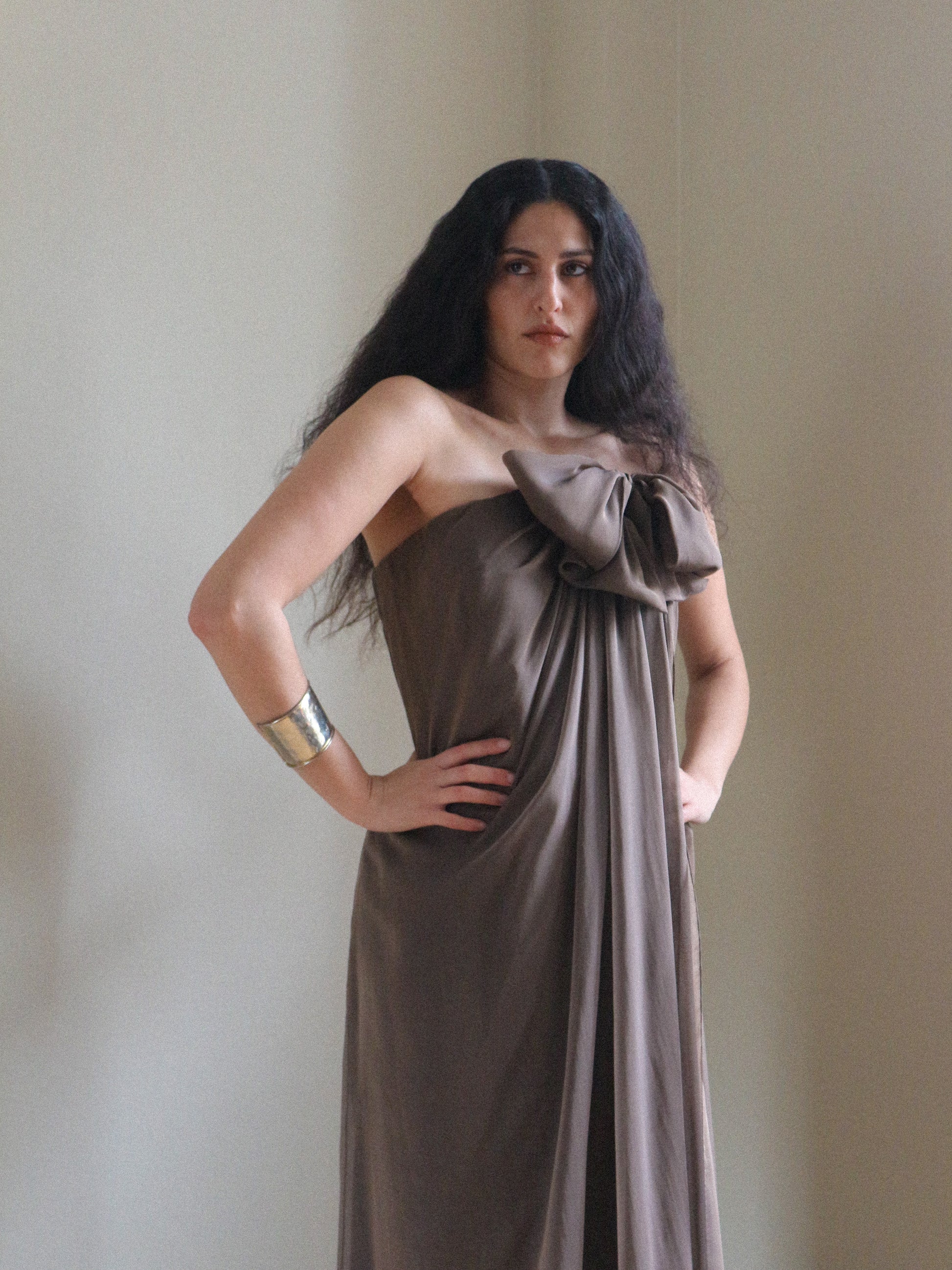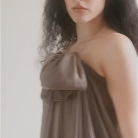 Exquisite silk chiffon gown in a milky brown, café au lait color. It's a very fine silk that is iridescent.
