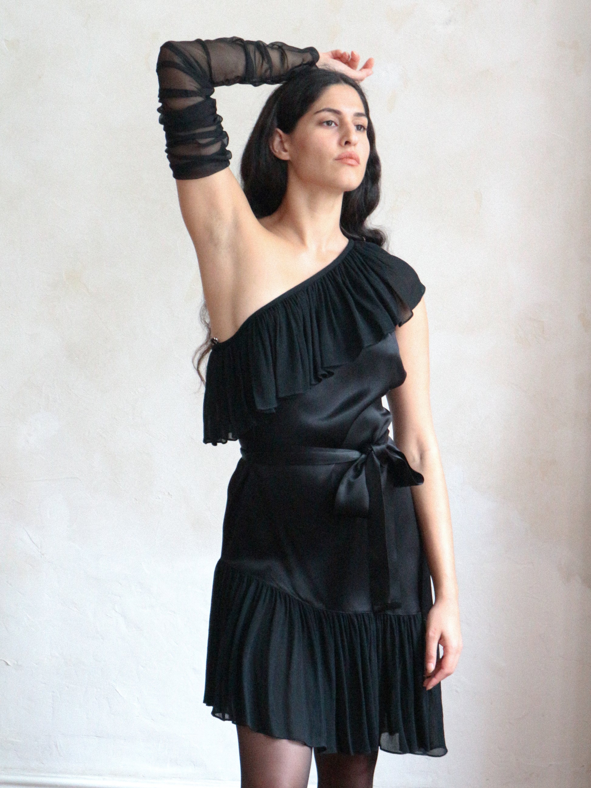 Yves Saint Laurent Spring 1980 Black Off Shoulder Cocktail Dress